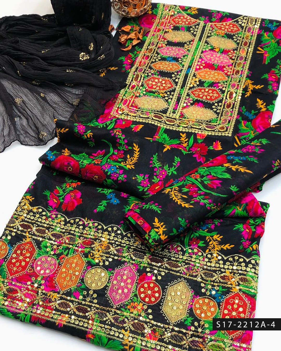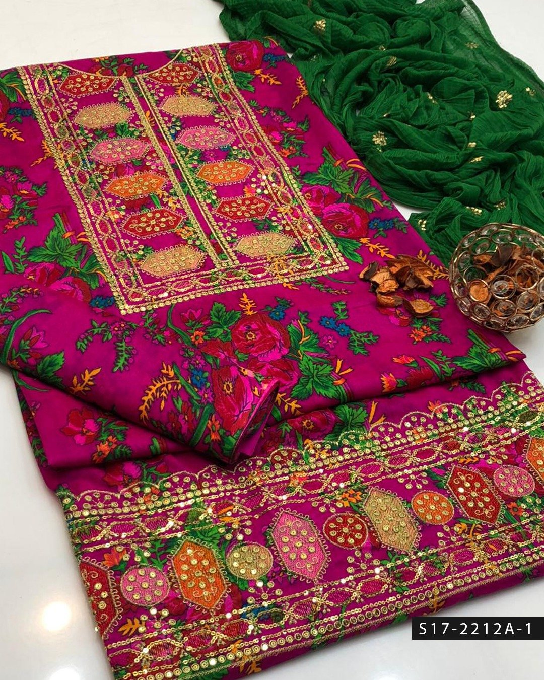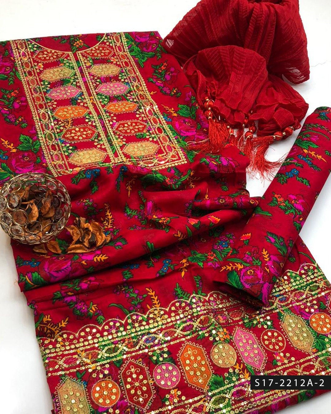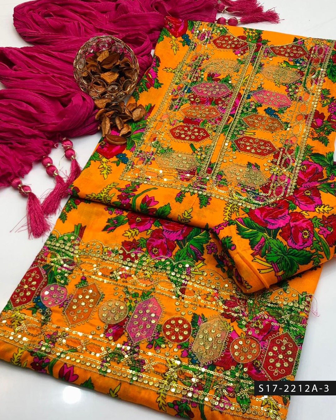 Paired with a digitally printed marina trouser, the ensemble maintains a cohesive and stylish appearance, ensuring both comfort and durability throughout the day. Completing the set is a lightweight chiffon chunat dupatta, adding softness, movement, and an elegant finish to the outfit.