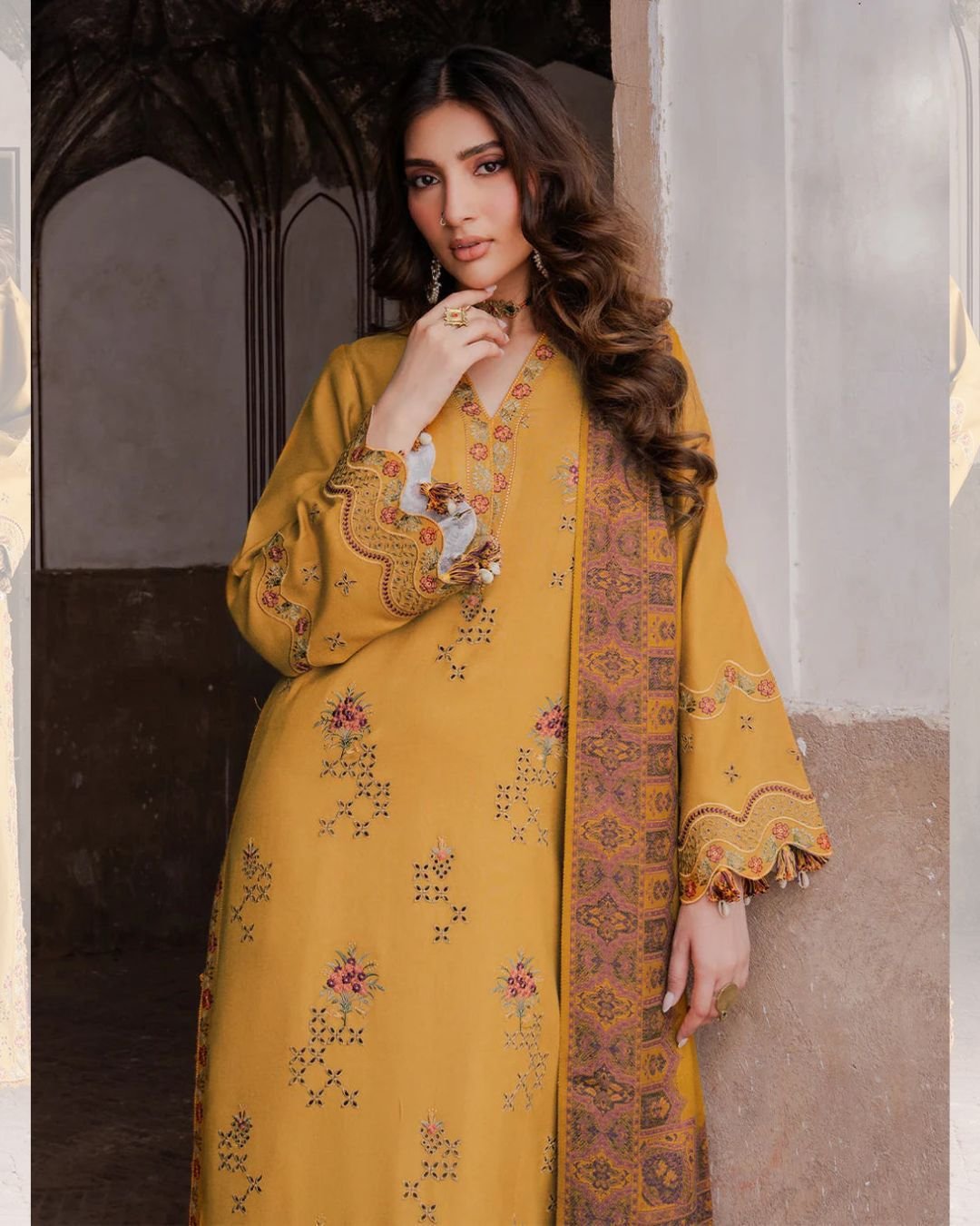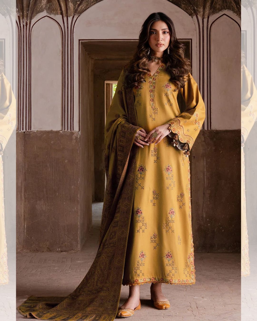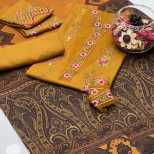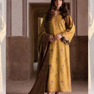 Step into elegance with the Dhanak 3-piece dress set. The shirt features intricate embroidery on the front, sleeves, and patchwork, paired with a simple Dhanak trouser for a balanced and graceful look. Completing the ensemble is a wool digital print shawl, adding warmth and sophistication. Perfect for festive occasions, family gatherings, or stylish day-to-day wear, this set combines traditional craftsmanship with modern elegance.