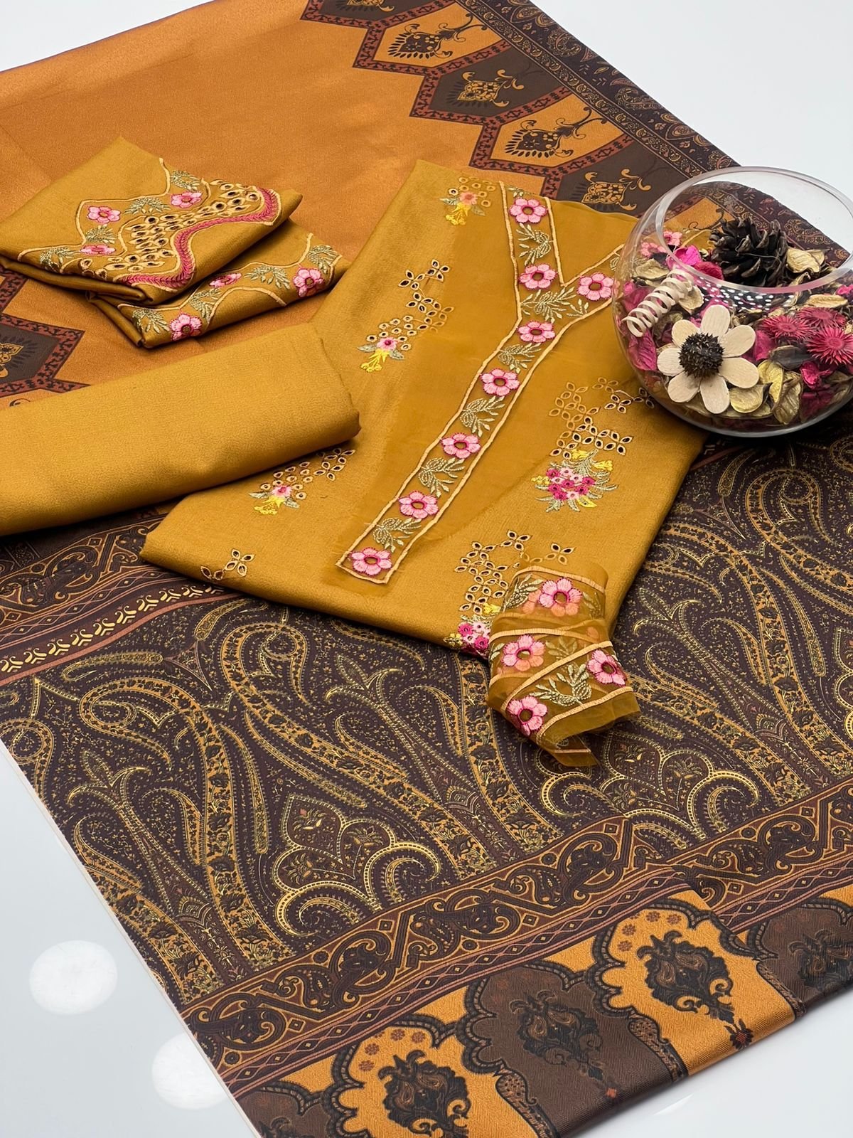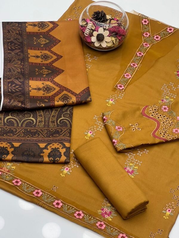 Dhanak Borring , Embroidery Shirt & Sleeves Including Front Patch With Simple Dhanak Trouser Along With Wool Digital Print Shawl 3Pcs Dress ๐Ÿ‘—..
