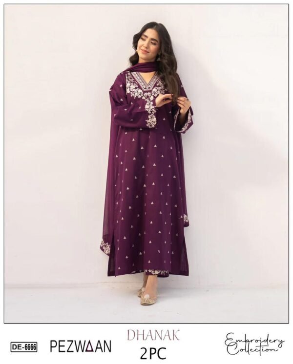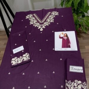 The 2-piece set includes an embroidered shirt with a plain trouser, giving a balanced, elegant appearance that suits all ages. With a cutting of 5.25 meters, the suit offers ample fabric for a perfect tailored fit. Whether you opt for a straight style, A-line kurti, or long shirt, this dress ensures effortless sophistication.