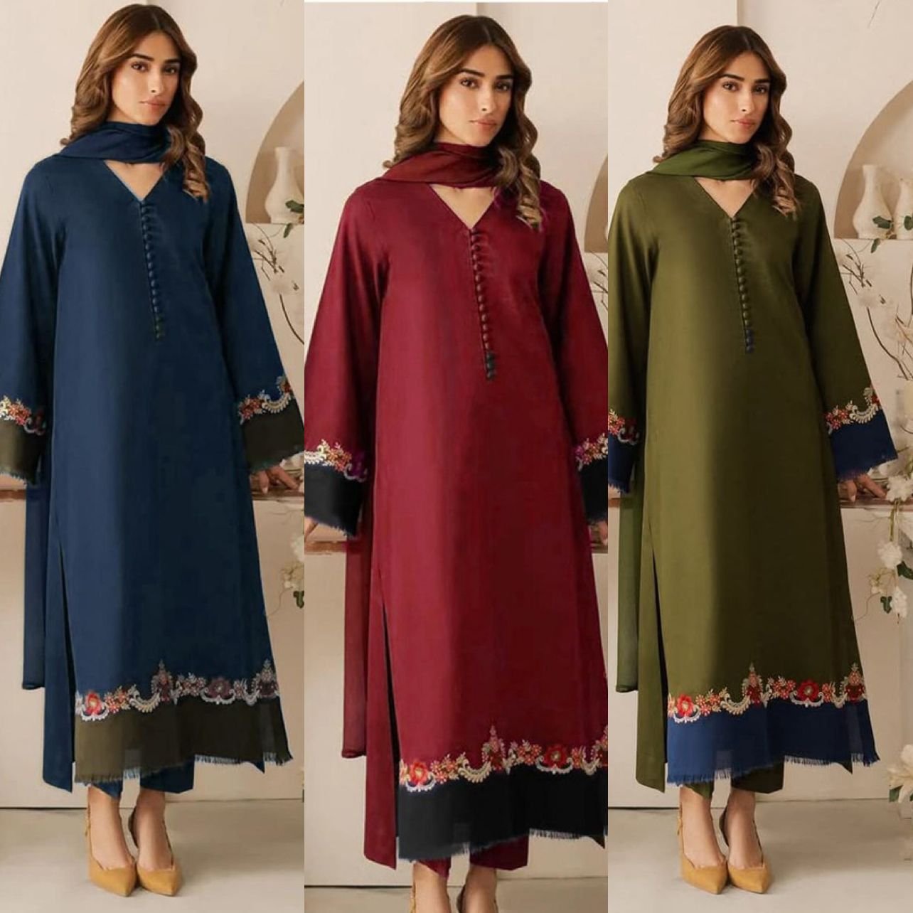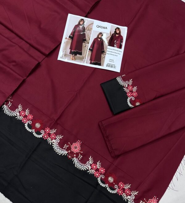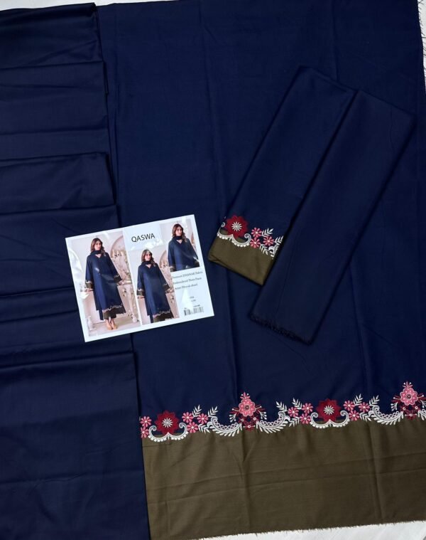 Elevate your wardrobe with the Qaswa Premium Dhanak 3PC Dress. This elegant set features a beautifully embroidered daman and sleeves, showcasing intricate craftsmanship. The Dhanak shawl adds a touch of sophistication, while the dyed back enhances the overall design. Perfect for festive occasions or stylish gatherings, this ensemble combines traditional artistry with modern elegance. Hit code now available for easy ordering!