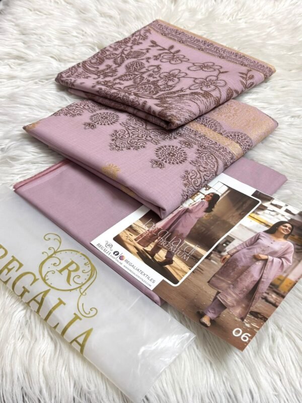 Elevate your everyday style with the Regalia Jacquard Collection 2025, designed for women who appreciate refined elegance and quality craftsmanship. This stunning 3-piece suit is crafted from premium Cotton Jacquard, offering a soft, breathable, and luxurious feel perfect for all seasons.