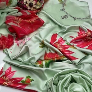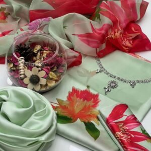 Elevate your wardrobe with this Shamoze Silk 3-piece dress set. The shirt features fancy neck work with patch detailing and digital prints, offering a stylish and elegant look. It is paired with a Shamoze silk trouser with matching digital prints for comfort and sophistication. Completing the ensemble is a silk digital print dupatta, adding grace and charm to the outfit. Perfect for festive occasions, parties, or special gatherings, this set combines traditional craftsmanship with contemporary elegance.