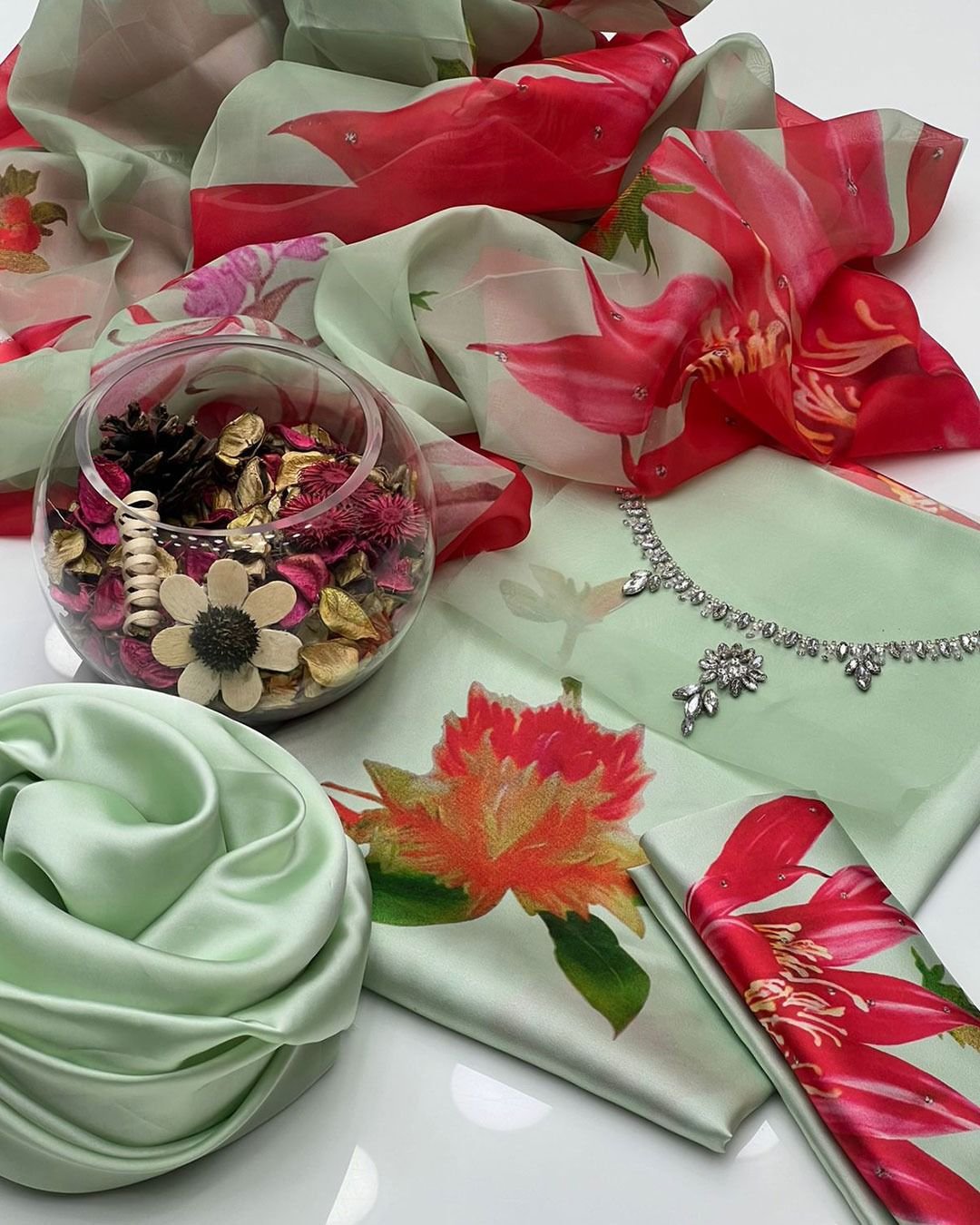 Shamoze Silk Fancy Neck Work Patch & Digital Print Shirt With Digital Print Shamoze Silk Trouser Along With Silk Digital Print Dupatta 3 Pcs Dress ๐Ÿ‘—.
