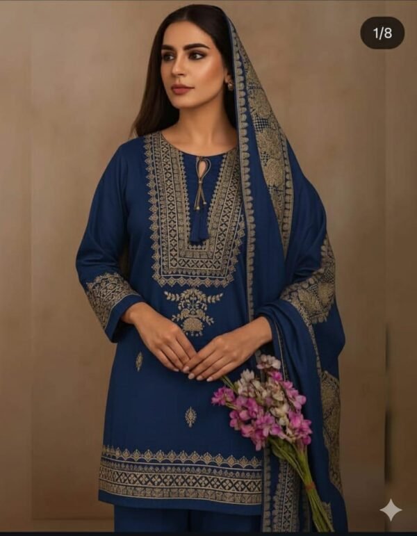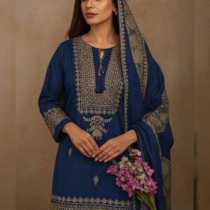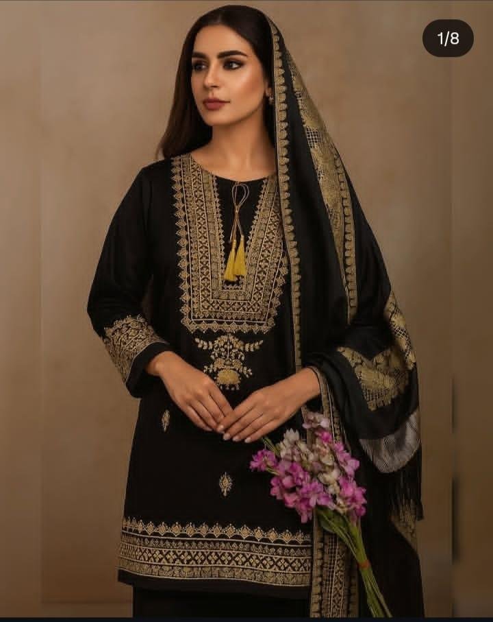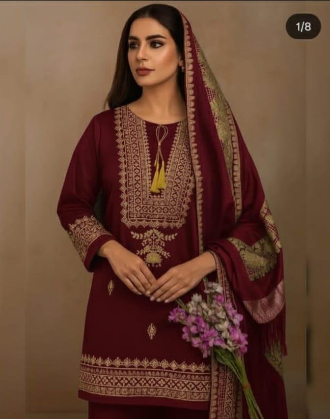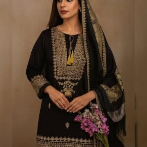 Elevate your style with this stunning 3-piece ensemble featuring traditional Indian craftsmanship. The shirt is crafted from Indian Susi fabric with intricate zari embroidery, offering a rich and elegant look. Paired with a Susi Banarasi trouser, it ensures comfort and style in every step. Completing the set is a Susi Banarasi jacquard shawl, adding a touch of luxury and sophistication. Latkan detailing enhances the overall charm, making this outfit perfect for festive occasions, weddings, or special gatherings.