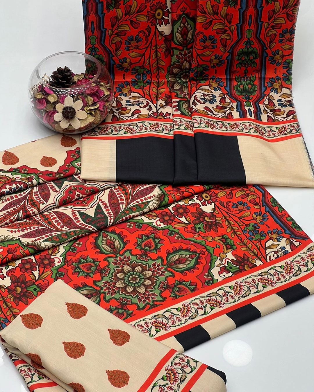 Winter Soft Slub Digital Print 3PC Dress โ€“ Red & Beige