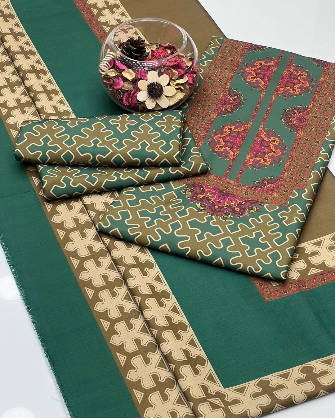 Winter Soft Slub Digital Print 3PC Dress โ€“ Teal & Brown