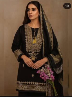 Winter Soft Slub Digital Print 3PC Dress – Brown & Black